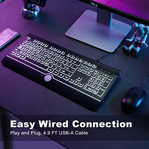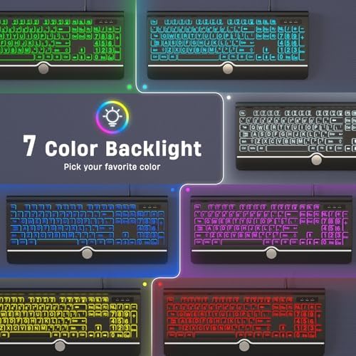 KOPJIPPOM Large Print Backlit Computer Keyboard, USB Full Size Wired Keyboards with 7-Colors Backlight, Wrist Rest, Light Up Keyboard for Windows, PC, Laptop - Easy to See, Easy to Setup
