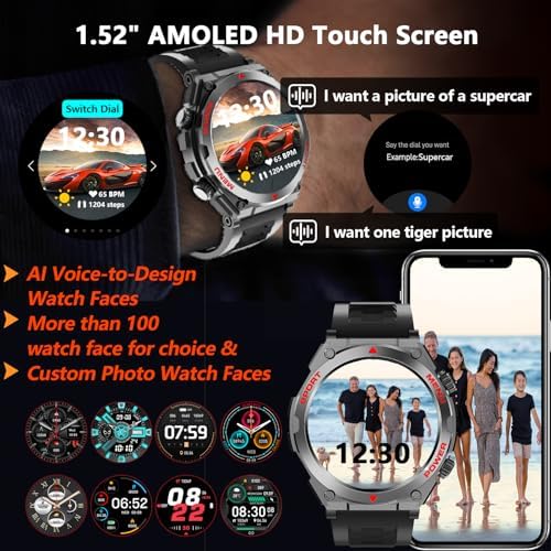 Military Smart Watch for Men With AI Q&A (Answer\/Make Call\/SMS Reply), 1.52" HD Smartwatch for Android Phones\/iPhone, 100+ Sport Mode Fitness Tracker with HR, SpO2, Sleep Monitor, IP68 Wate