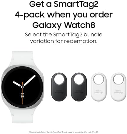 Samsung Galaxy Watch 8 40mm LTE Smartwatch, Silver w\/Galaxy SmartTag2 Bluetooth Tracker, 4 Pack (2 Black, 2 White)