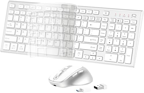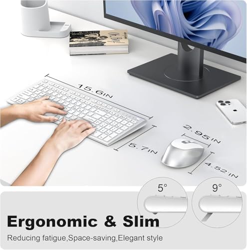 FENIFOX Wireless Keyboard and Mouse, Ergonomic Rechargeable Silent Quiet Slim Compact Full-Size USB C with Number Pad Flat Soft Cover for PC Computer Laptop Mac MacBook iMac TV Windows - Silver White